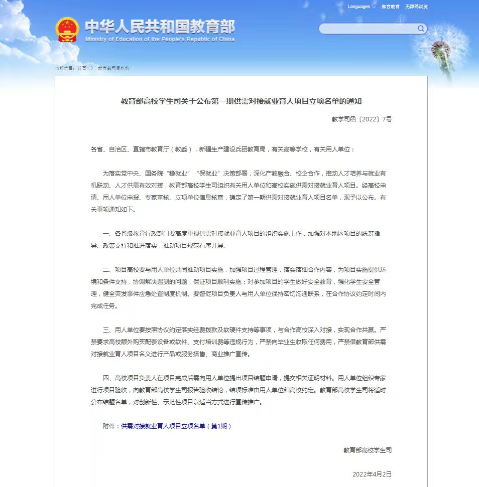 教育部高校员工司关于公布第一期供需对接就业育人项目立项名单的通知