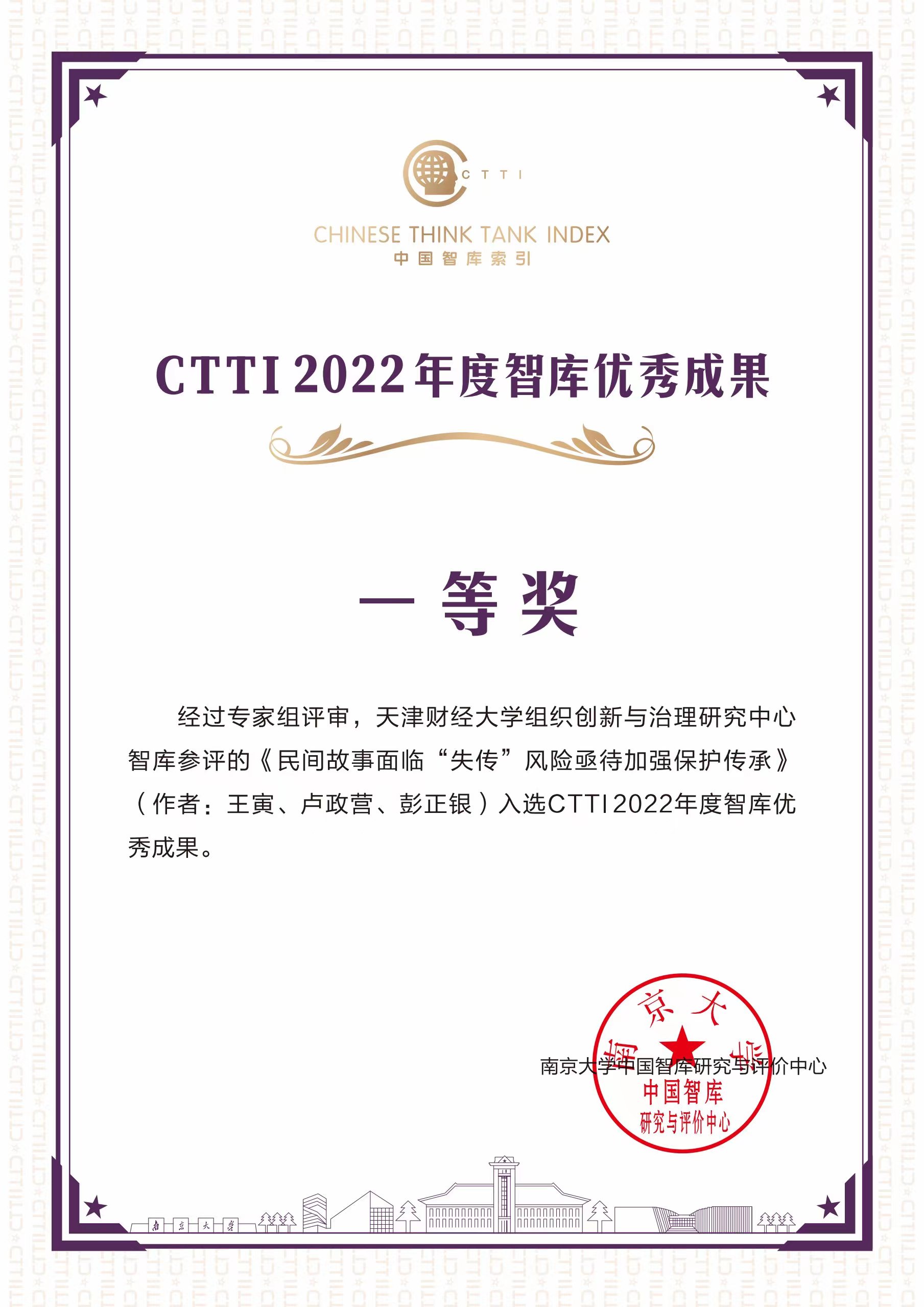 近日,“CTTI2022年度智库最佳案例与优秀成果”发布。公司共有3项成果获得智库优秀成果奖,其中由英国365集团网站王寅老师作为成果负责人,与卢政营副教授、彭正银教授共同申报的《民间故事面临“失传”风险 亟待加强保护传承》获全国一等奖。