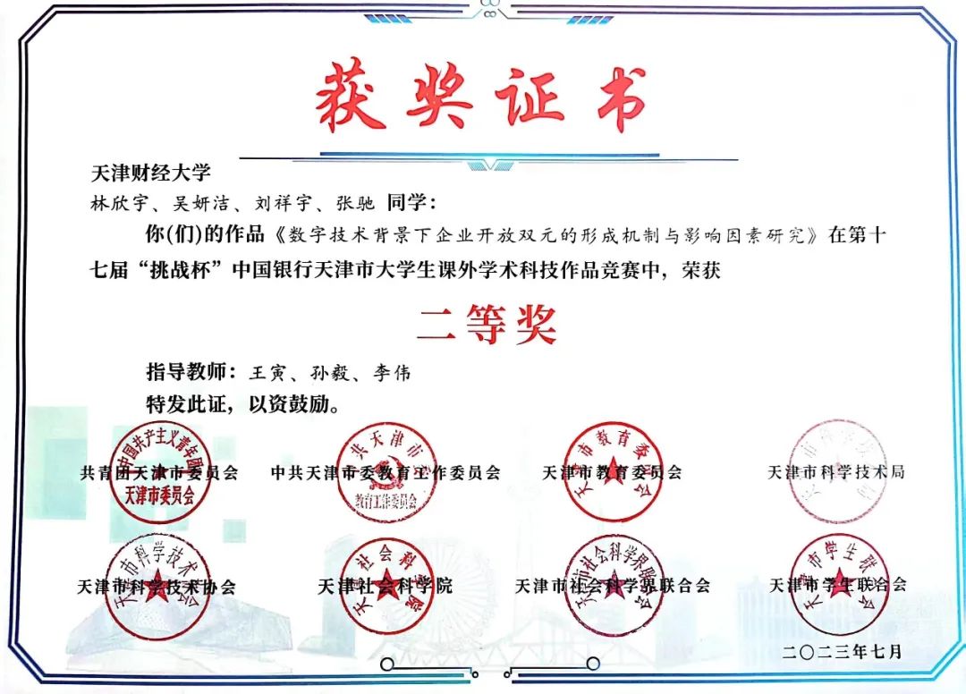 2023年5月26日至27日,由团市委、市委教育工委、市教委、市科技局、市科协、天津社科院、市社科联、市学联主办,天津工业大学承办,中国银行天津市分行支持的第十七届“挑战杯”天津市老员工课外学术科技作品竞赛完成终审决赛。公司推报的作品《如何实现区域创新生态系统高水平双元创新?一一基于战略三角的模糊集定性比较分析(fsQCA)》和《技术背景下企业开放双元的形成机制与影响因素研究》分别斩获第十七届“挑战杯”中国银行天津市老员工课外学术科技作品竞赛一等奖和二等奖!