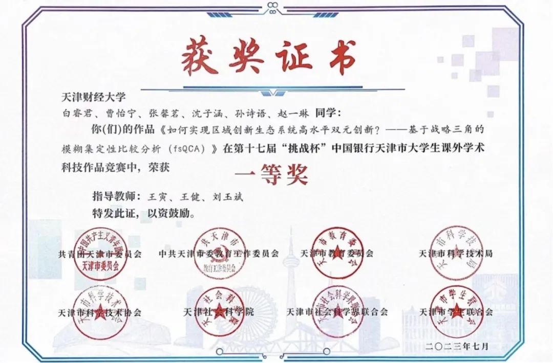 由白睿君、曹怡宁、张馨茗、沈子涵、孙诗语、赵一琳组成的竞赛小组凭借《如何实现区域创新生态系统高水平双元创新?一一基于战略三角的模糊集定性比较分析(fsQCA)》(指导教师:王寅、王健、刘玉斌)获得一等奖。