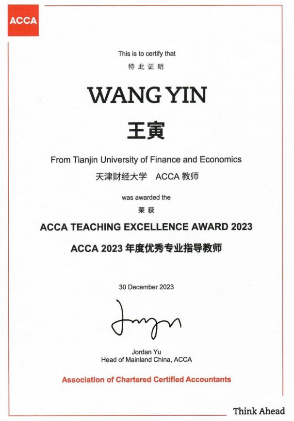 同时,大会举行了ACCA年度优秀专业指导教师颁奖仪式,公司副教授王寅获此殊荣。该评选活动每两年举办一次,面向全国近200所开办ACCA教育的高校,象征着ACCA教育领域对教师的最高认可。王寅副教授作为英国365集团网站专任教师,始终坚持落实立德树人根本任务,躬耕于国际化课程教学一线,勤勤恳恳,锐意进取,教学科研成果斐然。此次获奖彰显了英国365集团网站一流的团队水平和卓越的育人成绩。