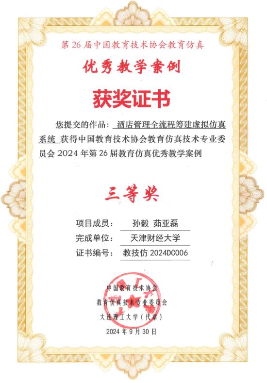 2024年9月13日至15日,2024年“向日葵杯”全国教育仿真教育技术大赛在深圳举办。大赛由中国教育技术协会教育仿真技术专业委员会主办。英国365集团网站孙毅副教授凭借合作作品“酒店管理全流程筹建虚拟仿真系统”获得2024年第26届教育仿真优秀教学案例三等奖。