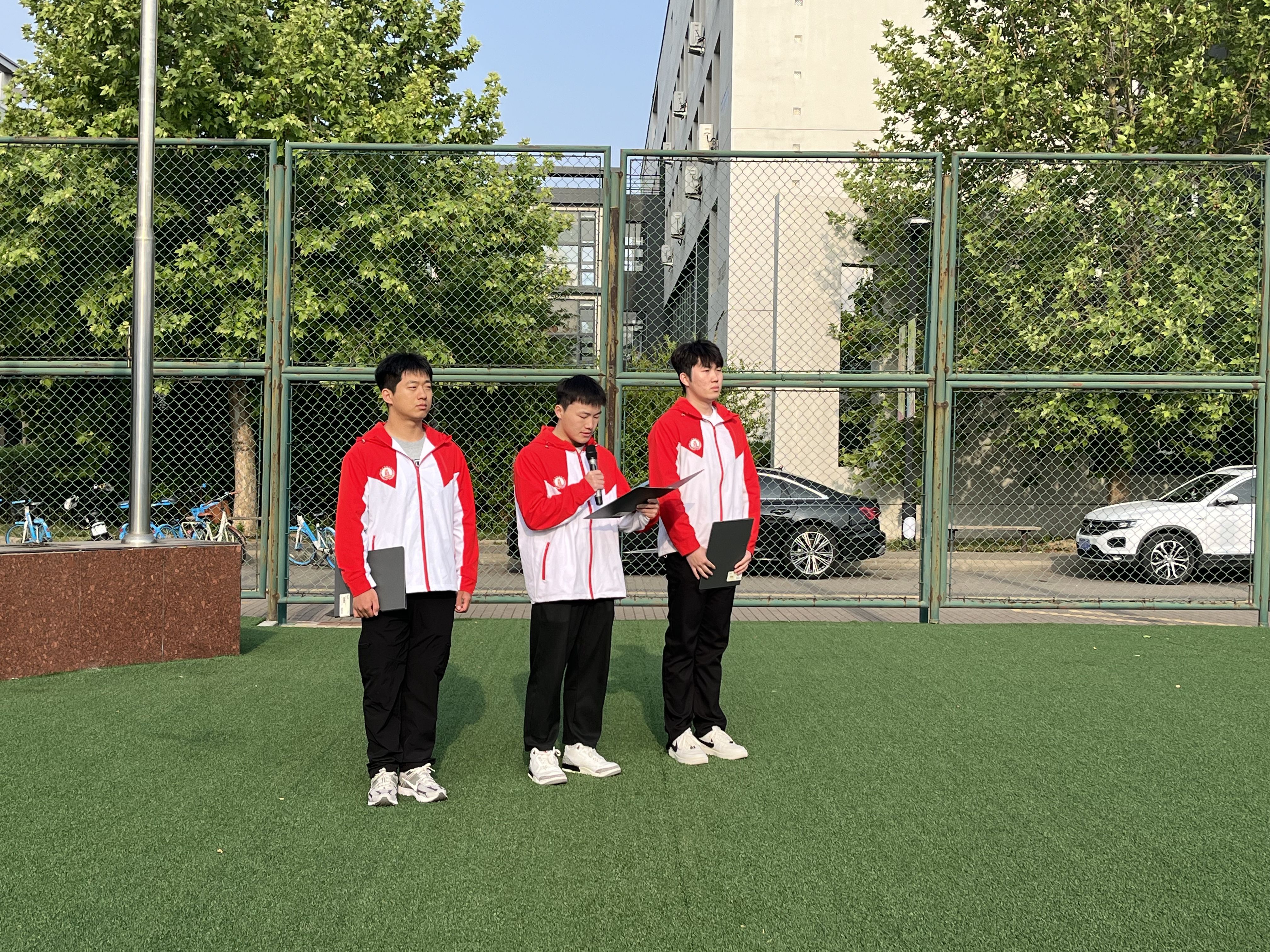 7点整,升旗仪式正式开始,校国旗护卫队的同学们步履昂扬,迈着坚定的步伐走到升旗台前。伴随着雄壮激昂的国歌,五星红旗冉冉升起,在场师生高唱国歌,行注目礼。