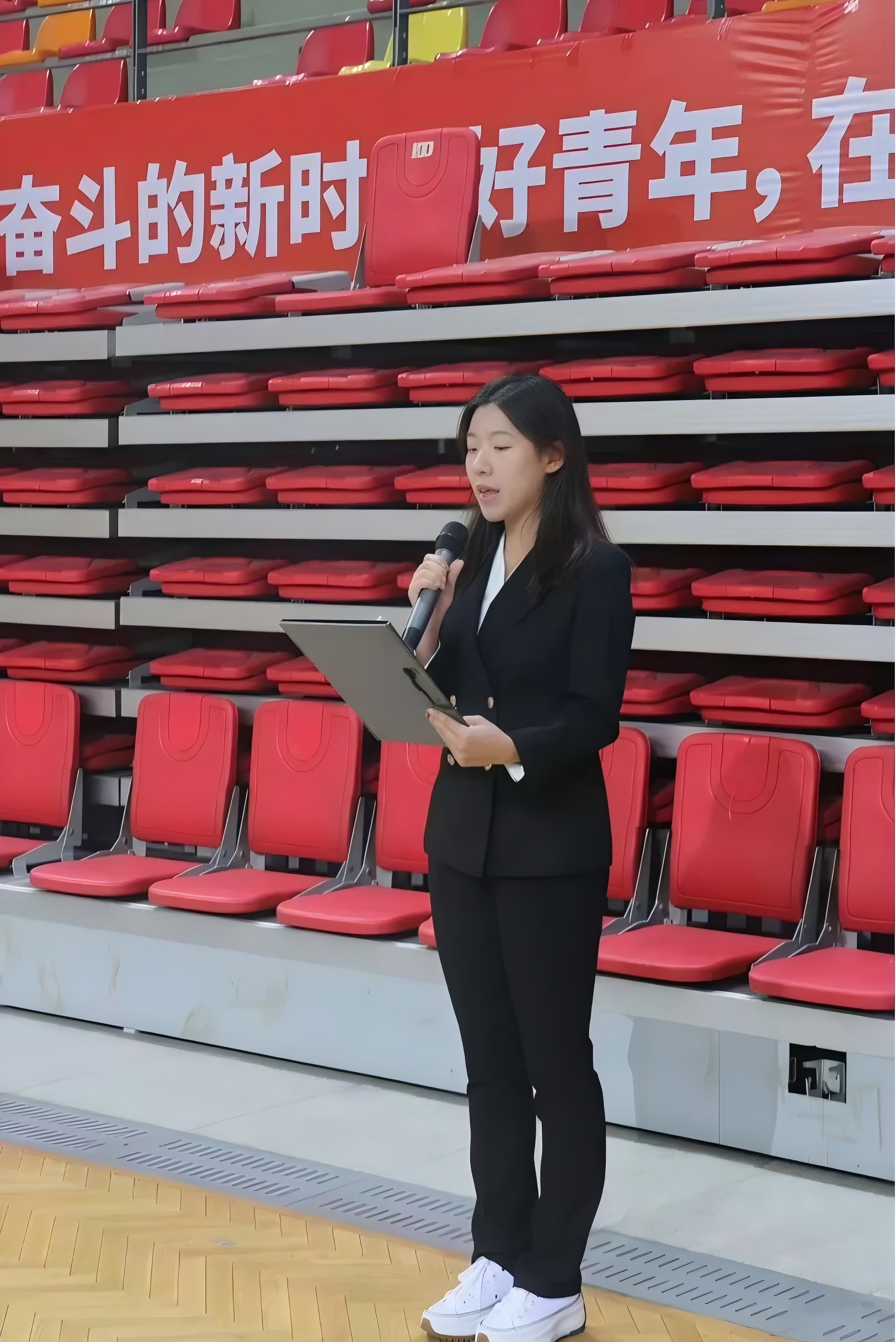 2024级员工代表ACCA2402班薛靖千在《庆祖国华诞 颂津沽风采》演讲中回顾了祖国波澜壮阔的发展和天津的历史变迁,表达了自己在天财勤奋学习,为未来职业生涯打下坚实基础的决心。她呼吁青年应胸怀爱国志,为实现中华民族伟大复兴的中国梦贡献力量,不负韶华,奋楫笃行。