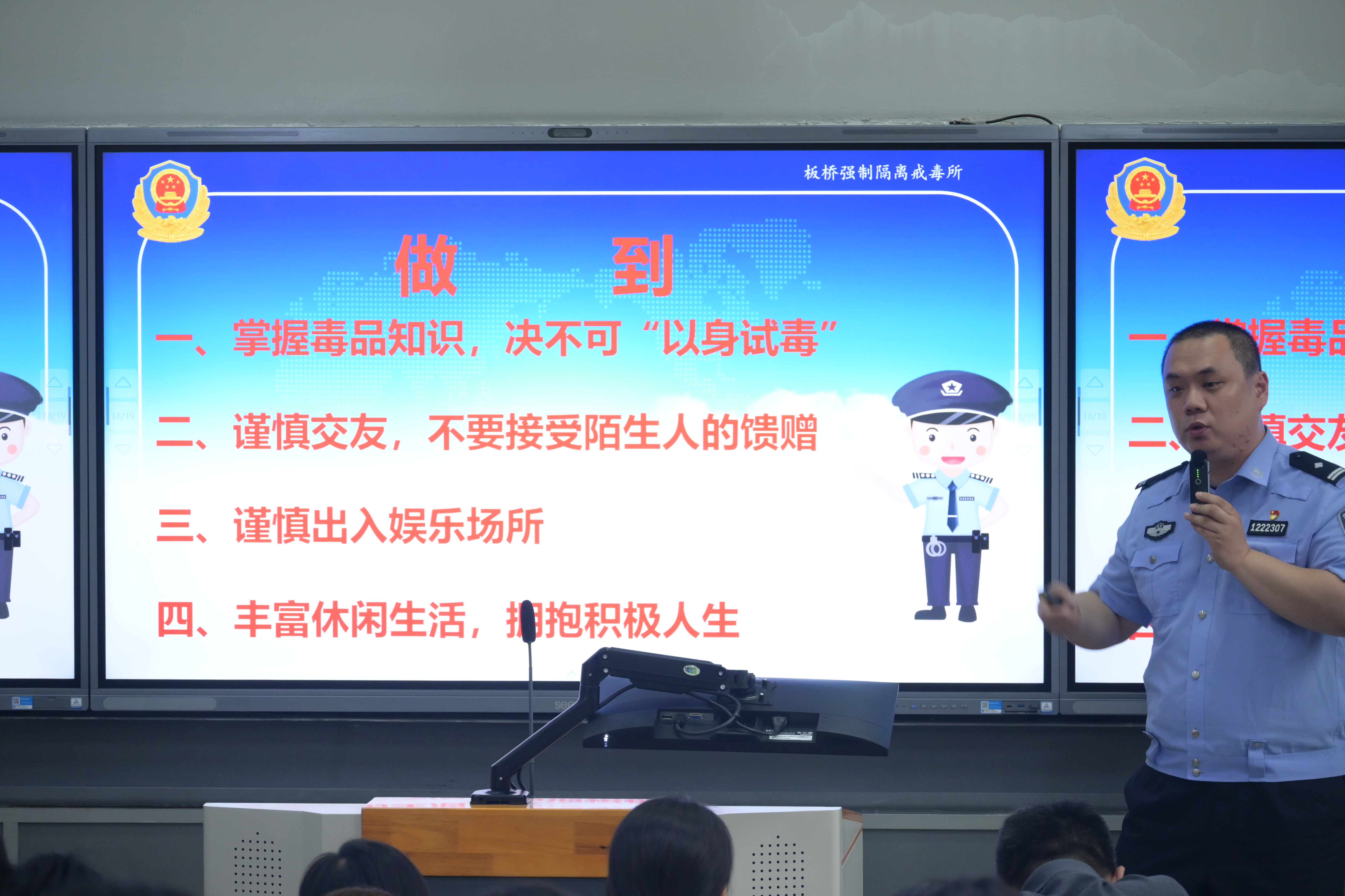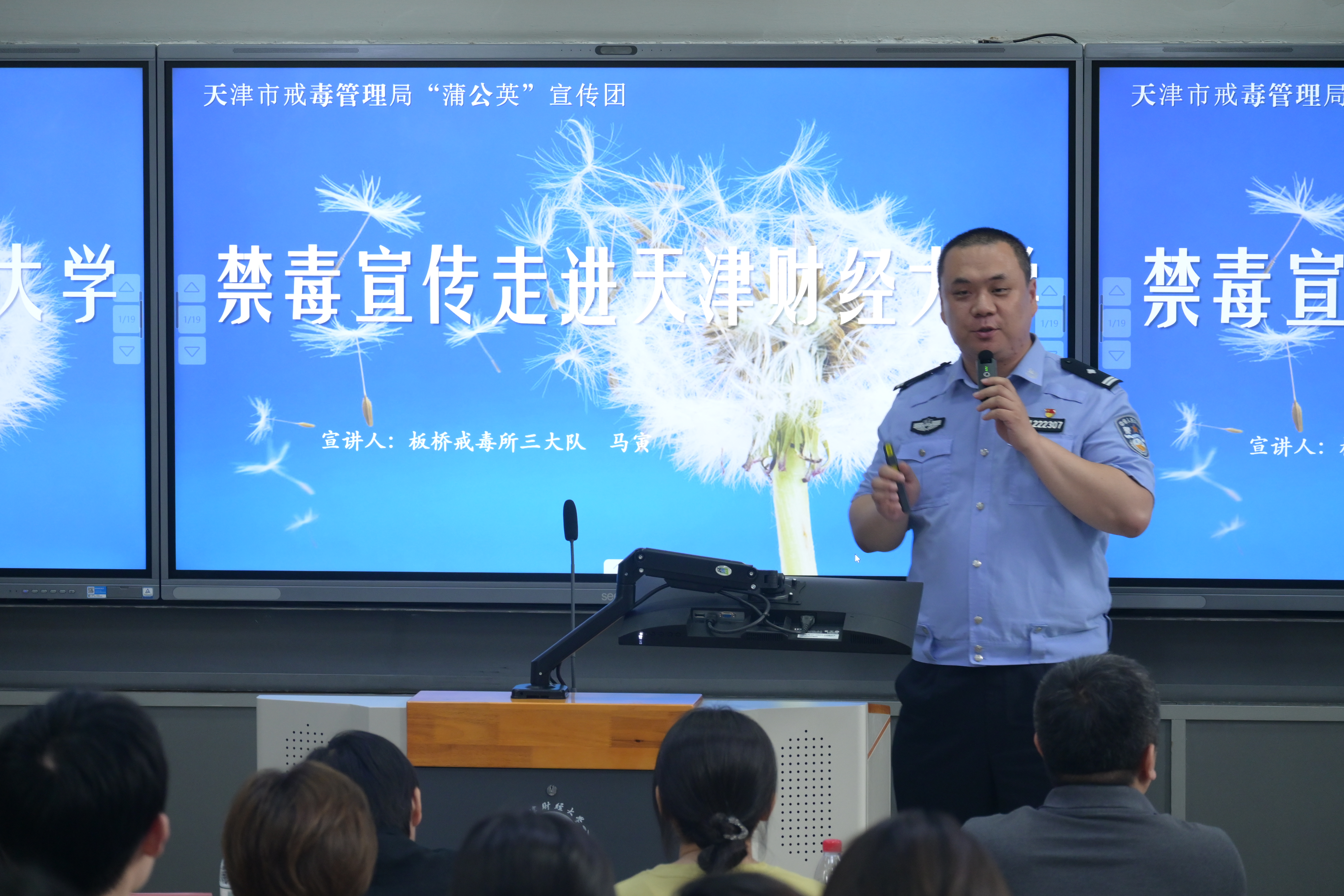 随后,天津市板桥戒毒所二级警长马寅结合近年来发生的真实事件,用生动的案例和数据,向同学们展示了毒品对个人、家庭和社会的严重危害。马警官还特别准备了仿真毒品模型和毒品知识宣传手册,让师生对禁毒知识有了更全面、更深刻的认识。